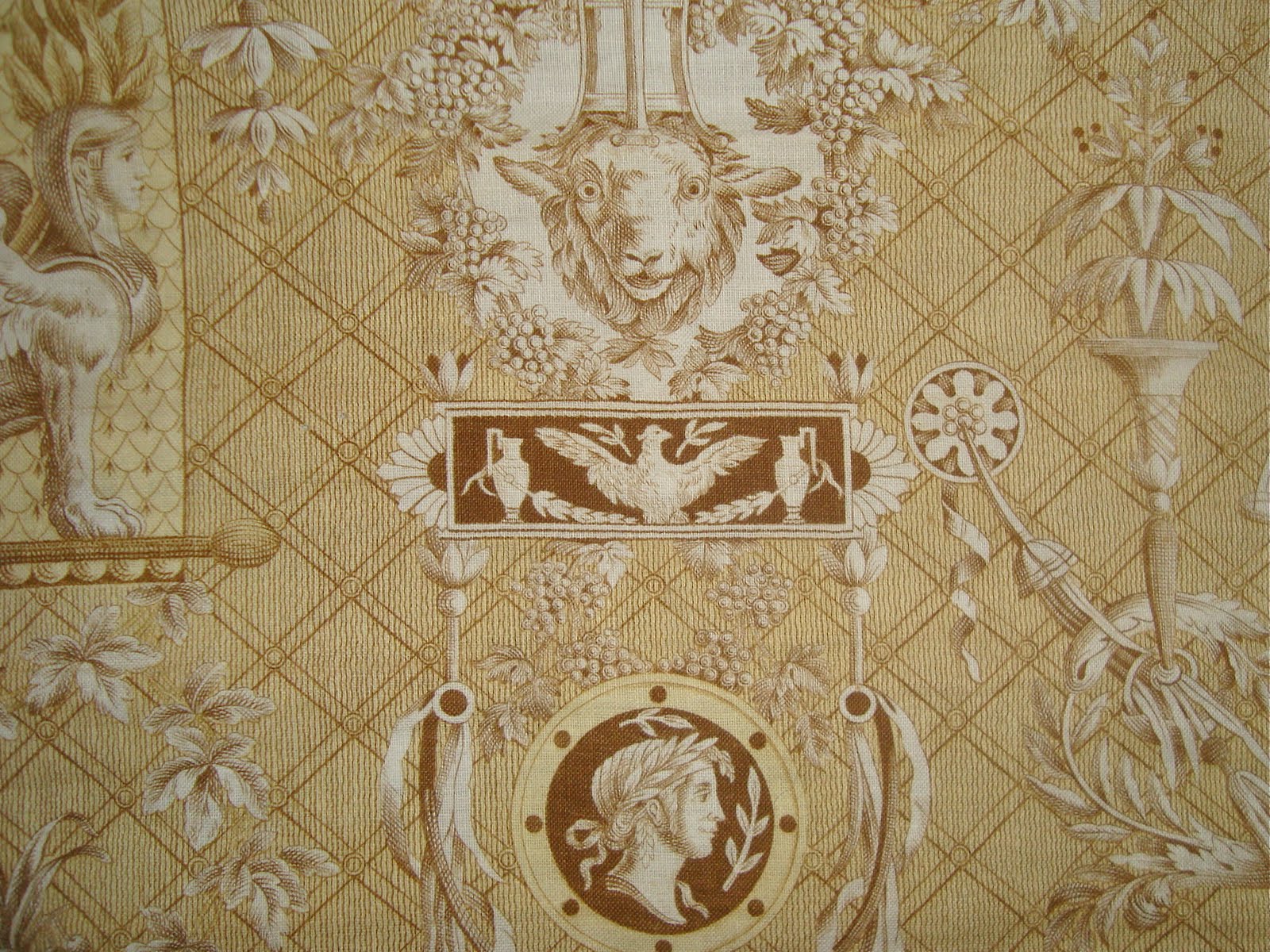 I recently bought a batch of small French toile fragments, some in good condition, others quite worn, but most are documented pieces that I have been able to identify using some of my books. They are mostly early 19th century pieces that either describe the progression in style from Rococo to Neoclassical, or full blown neoclassical design in all its glory. They also exploit the technology of roller printing to its limit, using background texture and pattern to link motifs that used to 'float' like islands on the background fabric because of the constraints of block printing techniques and to a lesser degree plate printing.